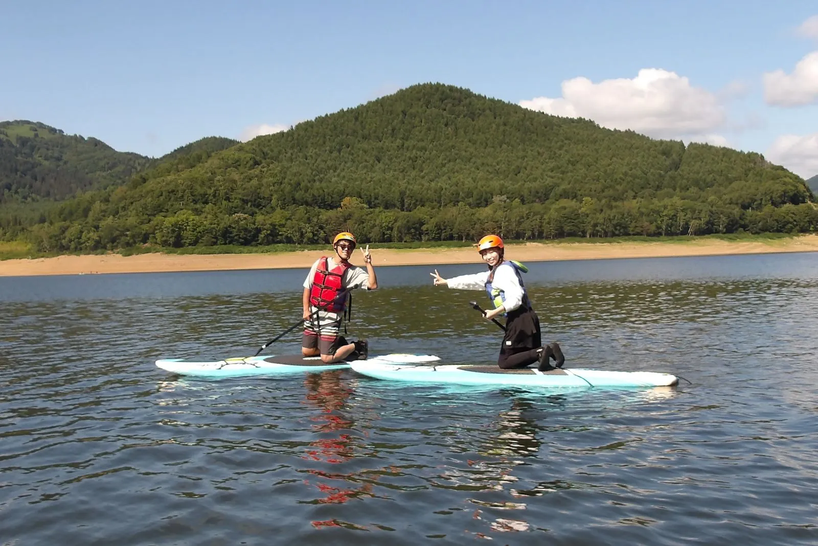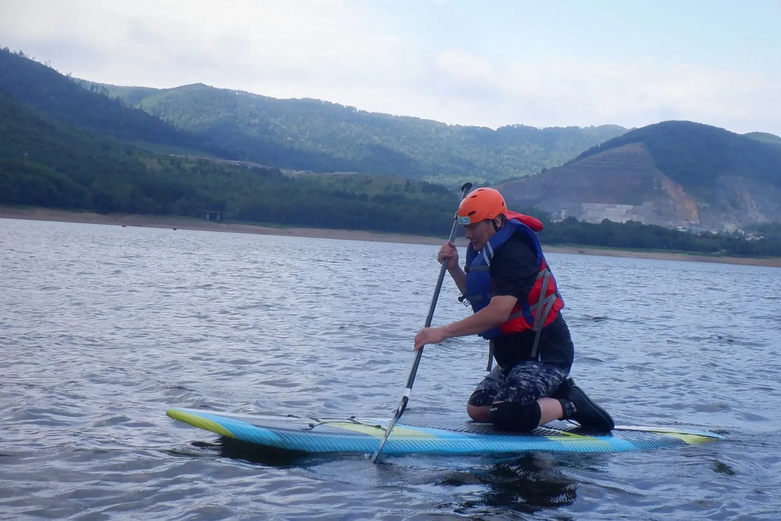 Time to hit the vast, calm waters of Lake Kanayama! Start by sitting or kneeling on your board to get a feel for the balance.