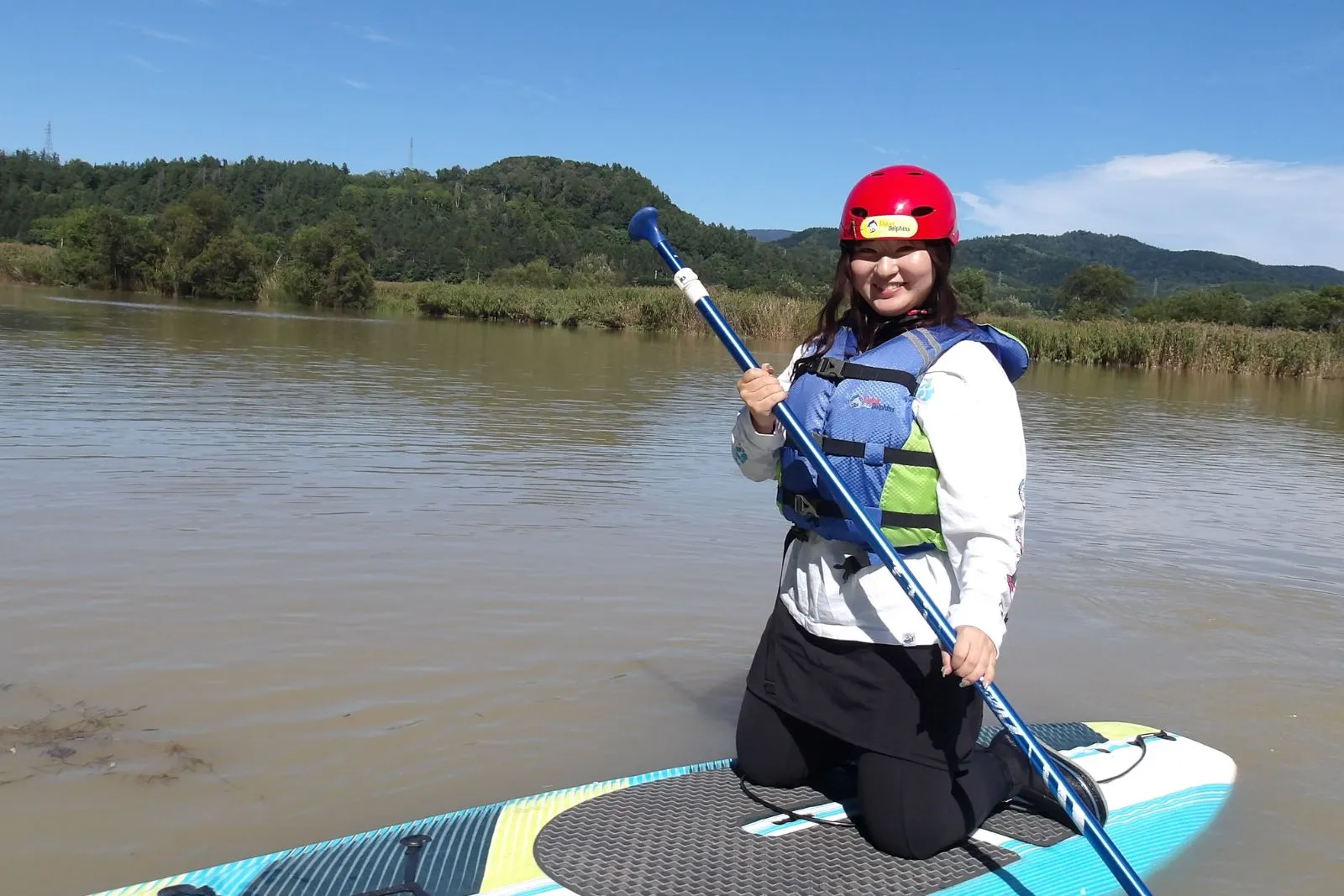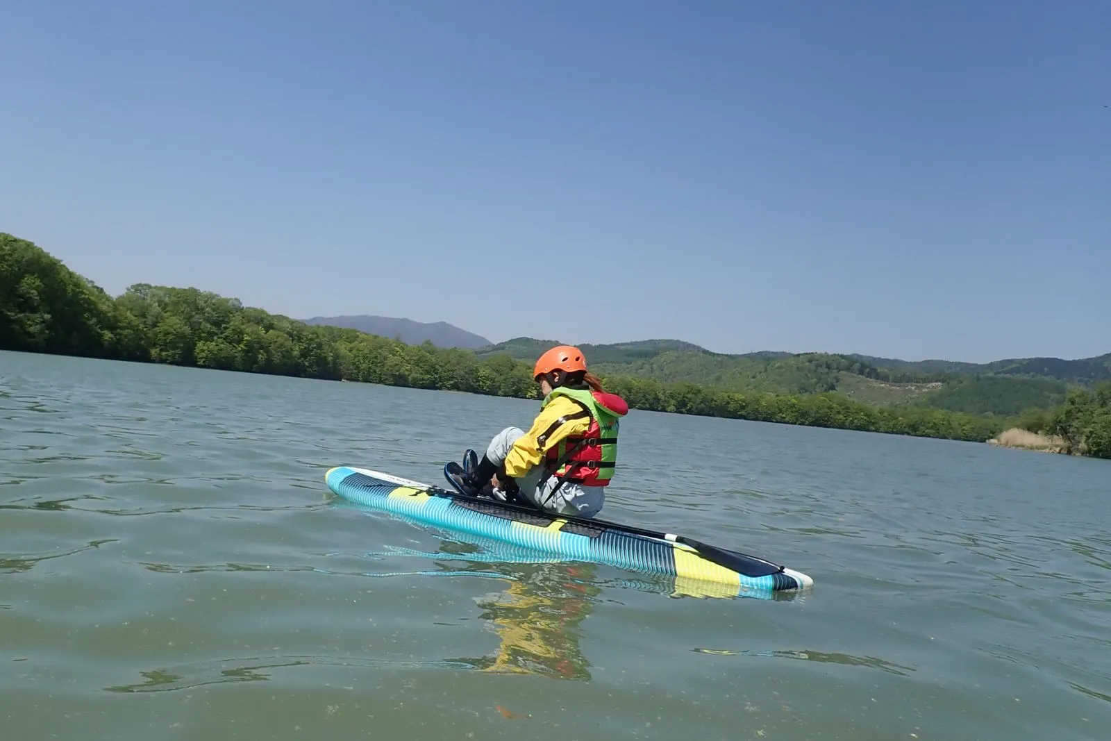 Time to hit the water! Start by sitting or kneeling on your board to get a feel for the balance on the calm lake.